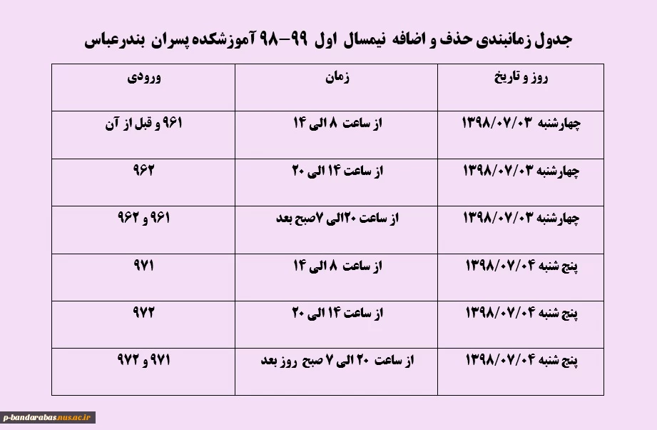 جدول زمان بندی حذف و اضافه
